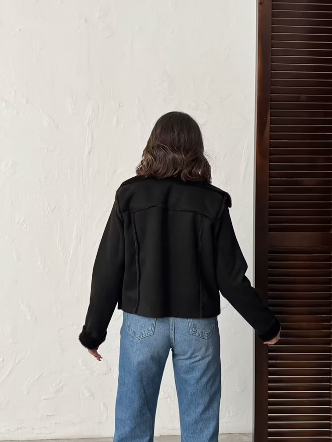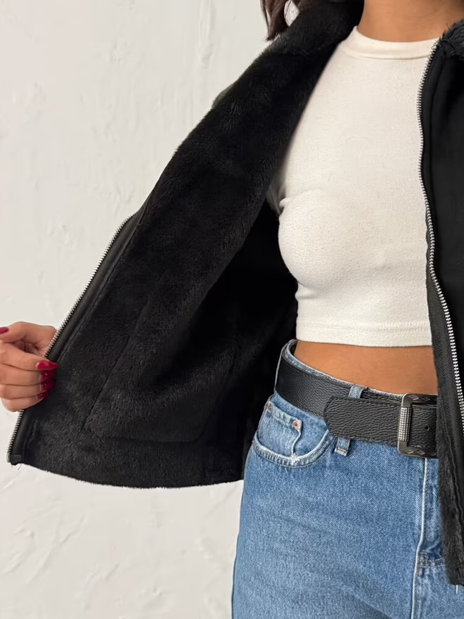 Jacheta din Piele Întoarsă stil Aviator cu Guler din Blană Ecologică, Neagră