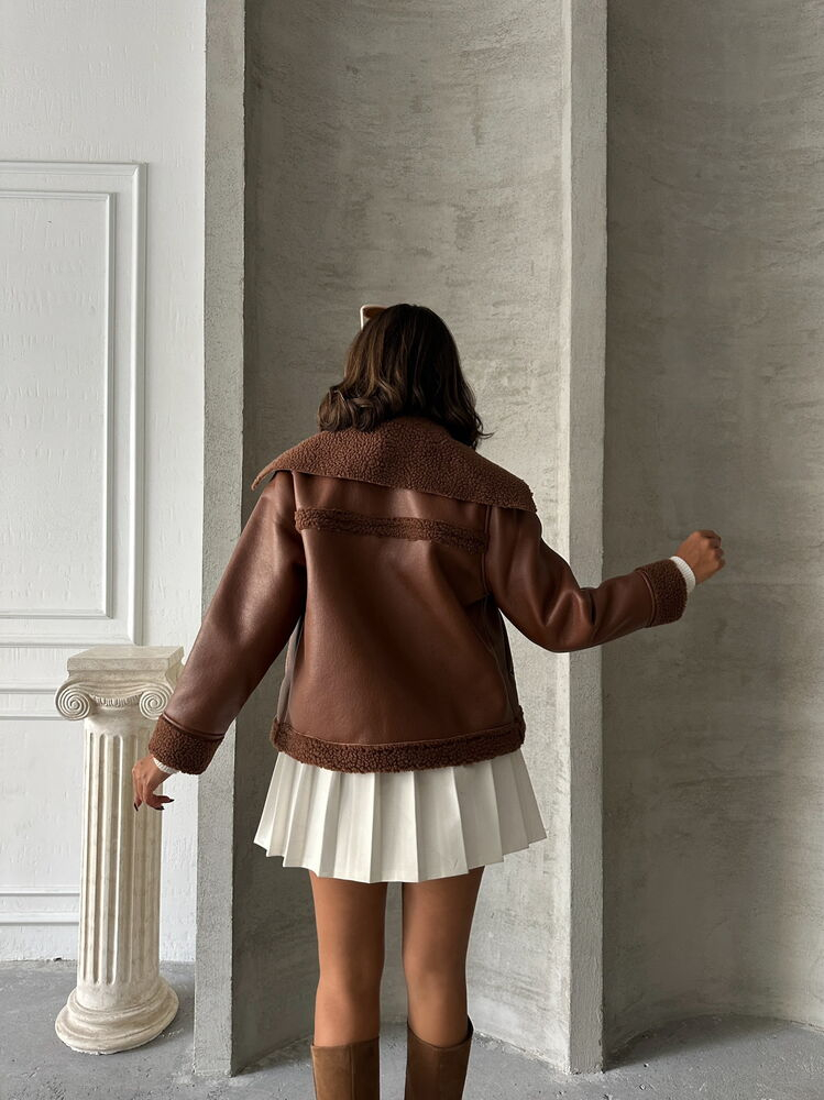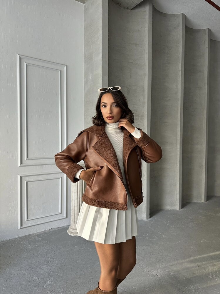Această jachetă în stil aviator/biker este piesa esențială care combină confortul termic cu estetica edgy și modernă. Fabricată din imitație de piele de înaltă calitate, jacheta este căptușită integral cu o blană sintetică (shearling) extrem de moale, oferind protecție optimă împotriva frigului.
