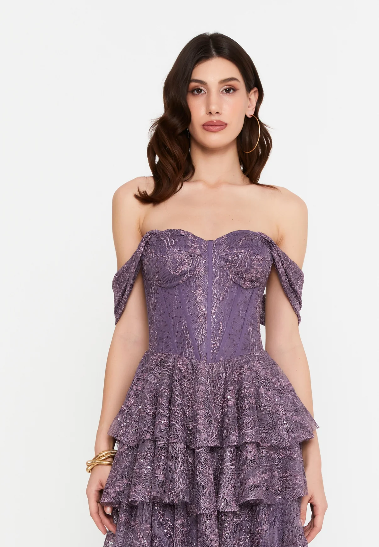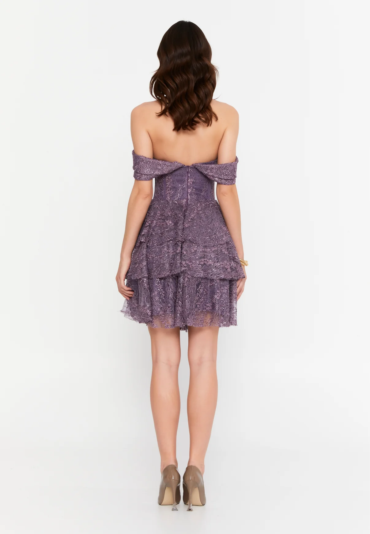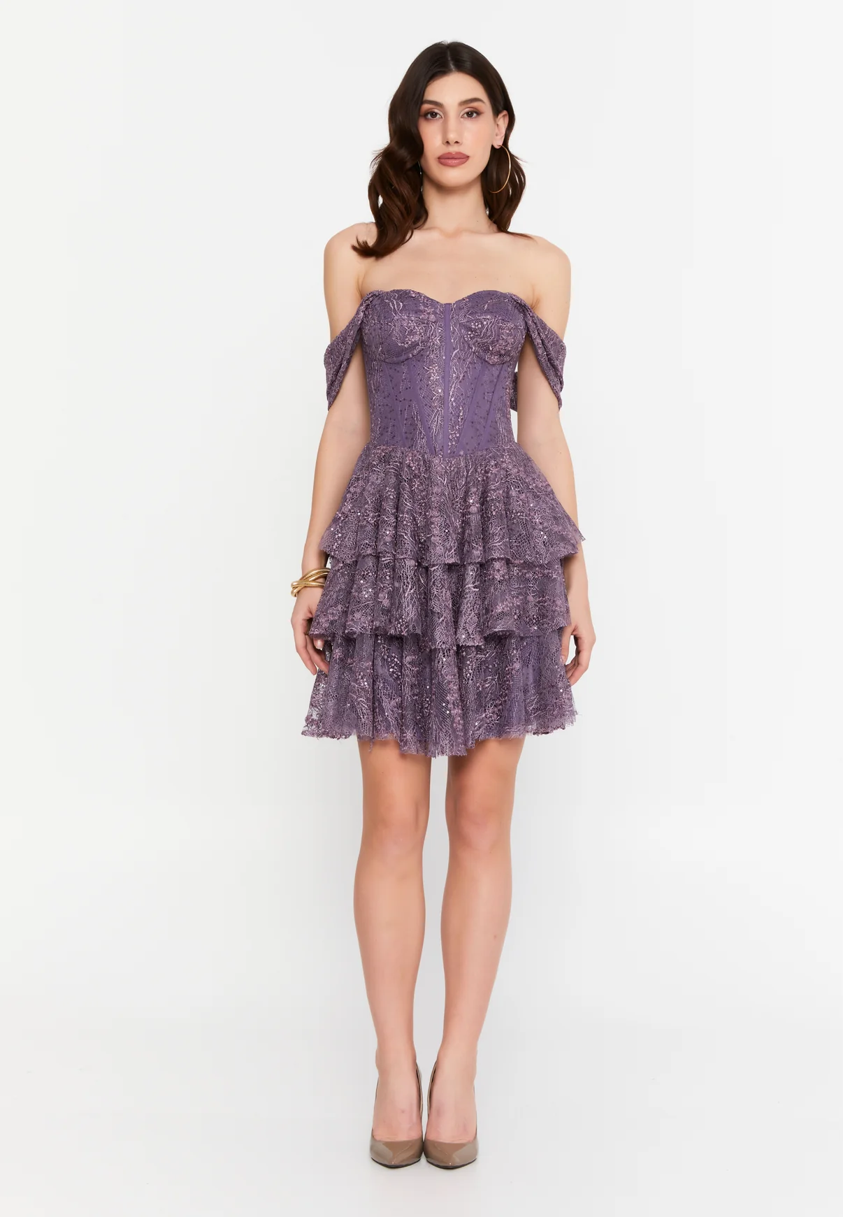 O declarație de stil dramatică, perfectă pentru nopțile în care vrei să fii în centrul atenției. Corsetul tip bustieră este completat de umeri goi, în timp ce fusta scurtă, cu volane etajate din dantelă, adaugă textură și mișcare. Eleganță seducătoare.
