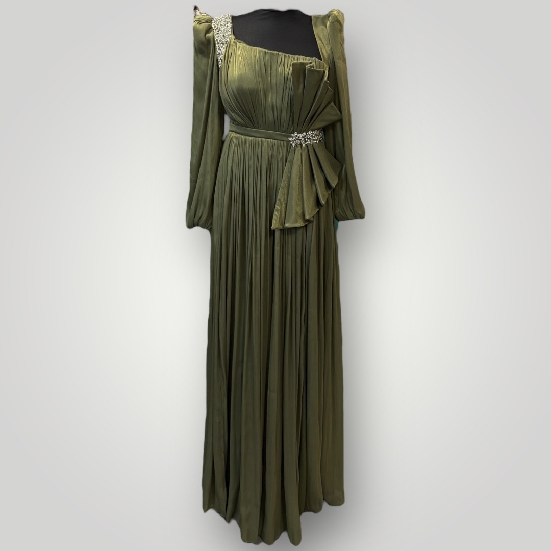 Rochie elegantă de seară din Voal Plisat, într-o nuanță sofisticată de Verde Măsliniu. Designul asimetric combină un decolteu Square-Neck cu o mânecă lungă bufantă. Talia este accentuată de o fundă drapată și o cataramă strălucitoare. Crăpătura frontală completează perfect look-ul.