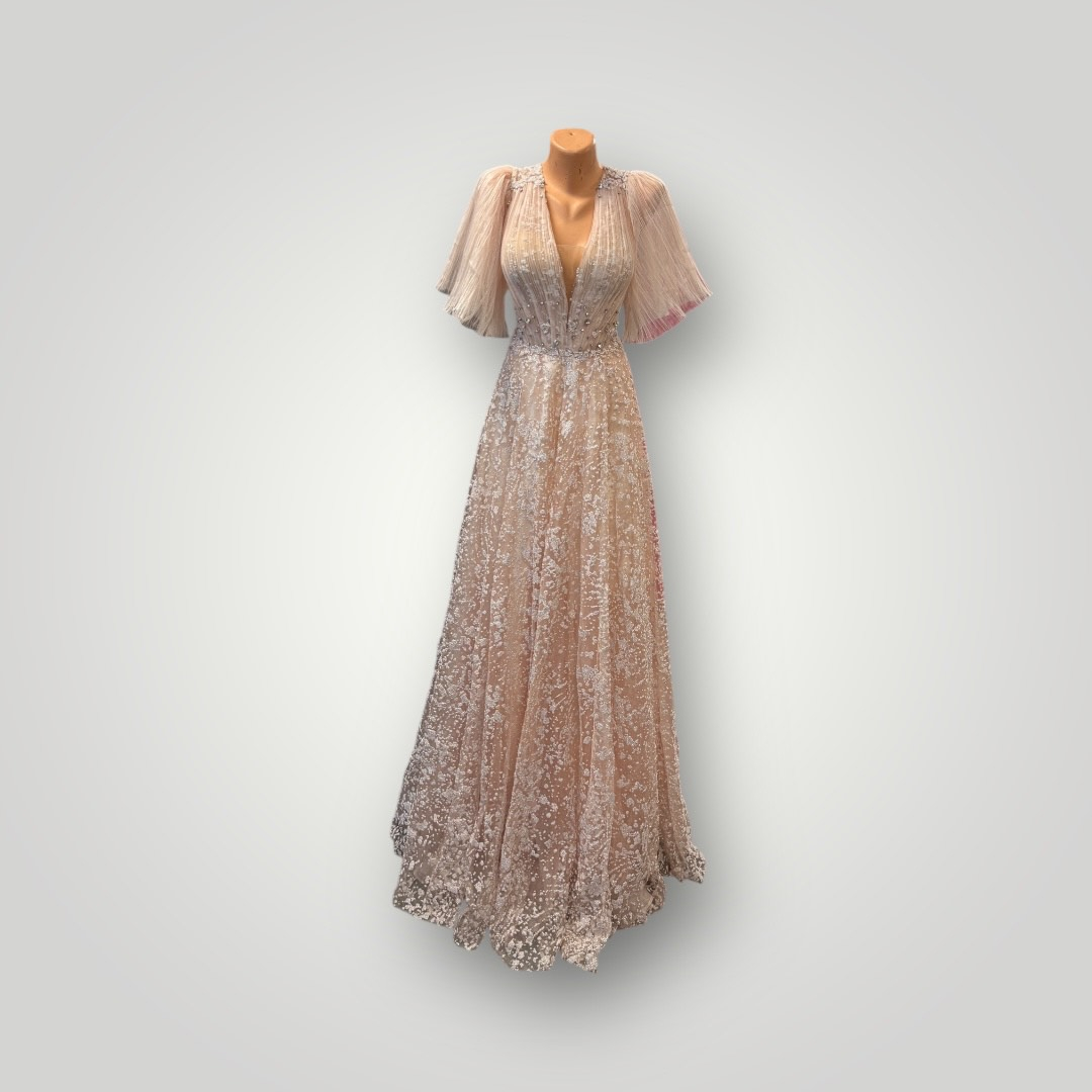 Rochie Maxi de poveste, realizată din tulle (plasă) brodată integral cu sclipiri fine și aplicații. Decolteul adânc în V, cu detalii discrete din mărgele la bust, este completat de mâneci fluture (cape) elegante și plisate. Croiala A-line, fluidă, cu talia marcată de o bandă subțire și corset pe spate, oferă o siluetă romantică și regală. Ideală pentru nașă, soacră sau orice eveniment de gală.