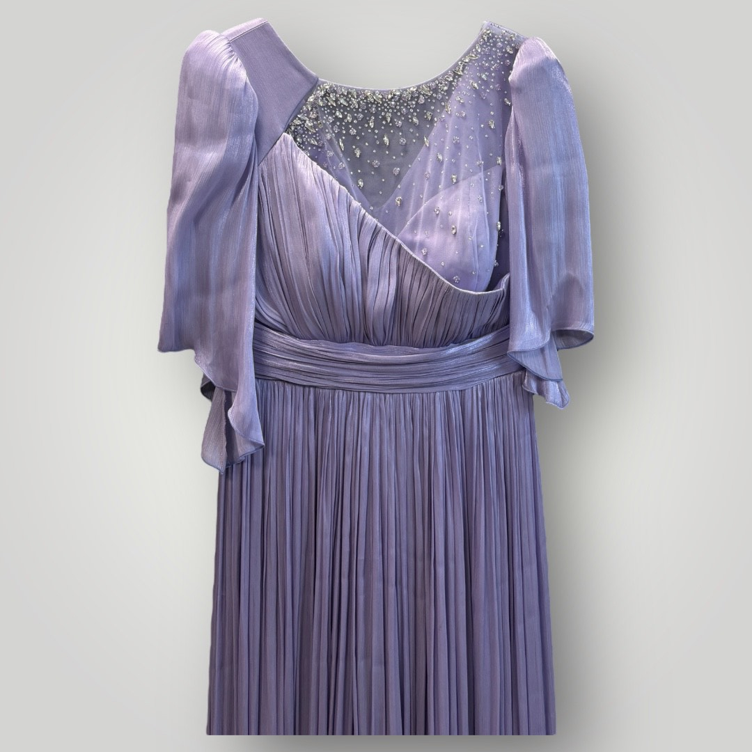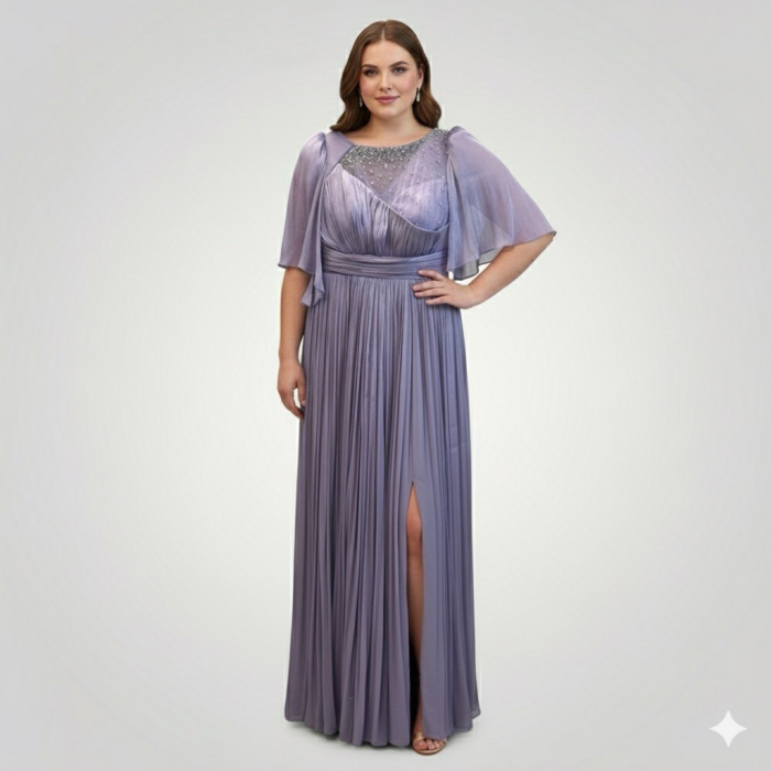 Rochie Maxi rafinată din chiffon plisat, în nuanța elegantă de Mov Lavandă. Decolteul tip bărcuță este finisat cu o inserție superbă de mărgele și pietre, adăugând o notă de strălucire. Mânecile tip fluture (cape) oferă un aer romantic și acoperire, iar fusta fluidă este completată de o crăpătură pe picior. O alegere superbă pentru ocazii speciale și doamnele plus size.