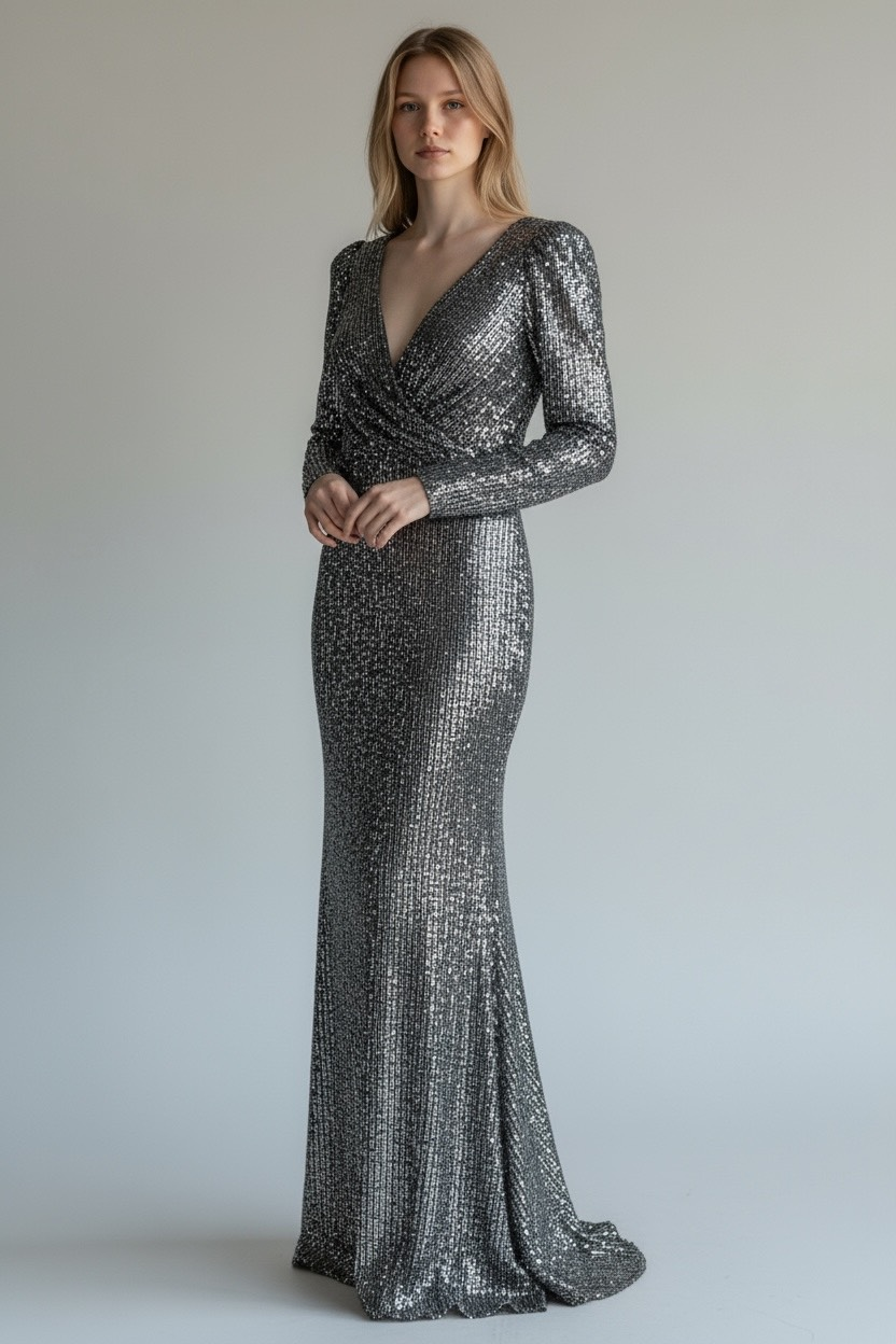 Rochie Maxi spectaculoasă, acoperită integral cu paiete argintii, ce oferă o strălucire de neegalat. Designul elegant prezintă un decolteu adânc în V, cu un efect petrecut la bust, și mâneci lungi, mulată pe corp. Croiala tip sirenă pune în evidență silueta, culminând cu o trenă discretă. Este piesa perfectă pentru a impresiona la evenimente de seară, petreceri glam sau baluri.